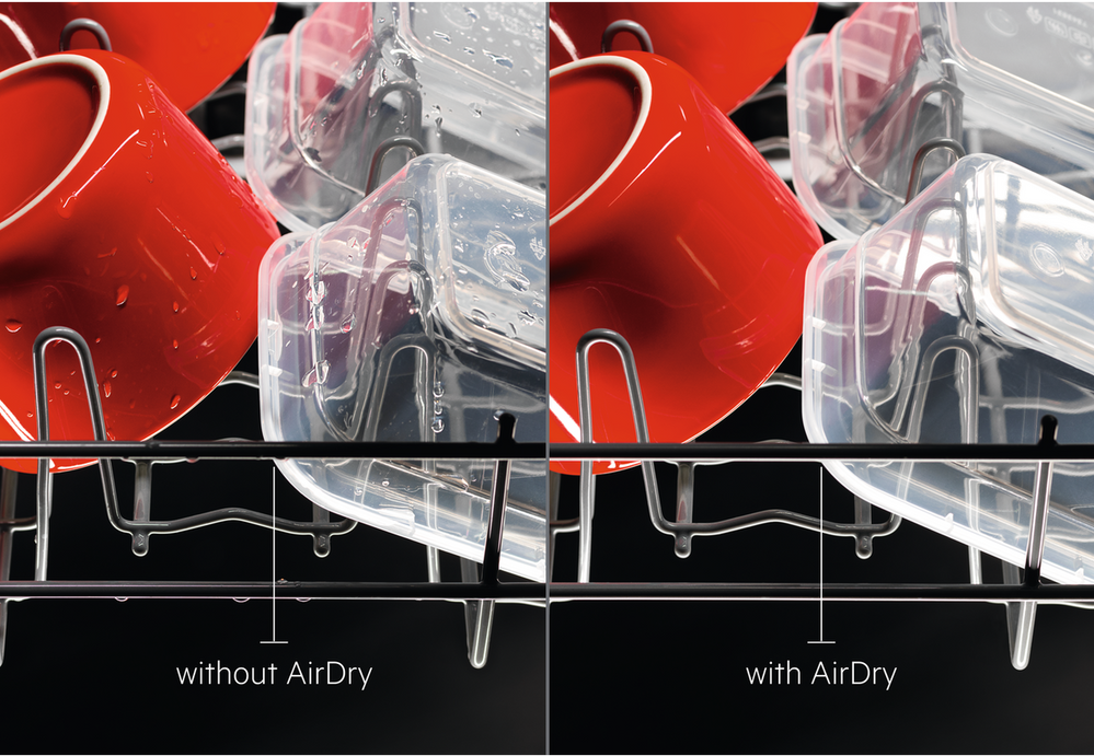 Το AirDry προσφέρει έως και 3 φορές καλύτερη απόδοση στεγνώματος σε σύγκριση με κλειστά συστήματα. Η πόρτα ανοίγει αυτόματα στο τέλος της φάσης στεγνώματος και ο αέρας κυκλοφορεί μέσα στο μηχάνημα. Τα πιάτα βγαίνουν τελείως στεγνά. Κάθε φορά.