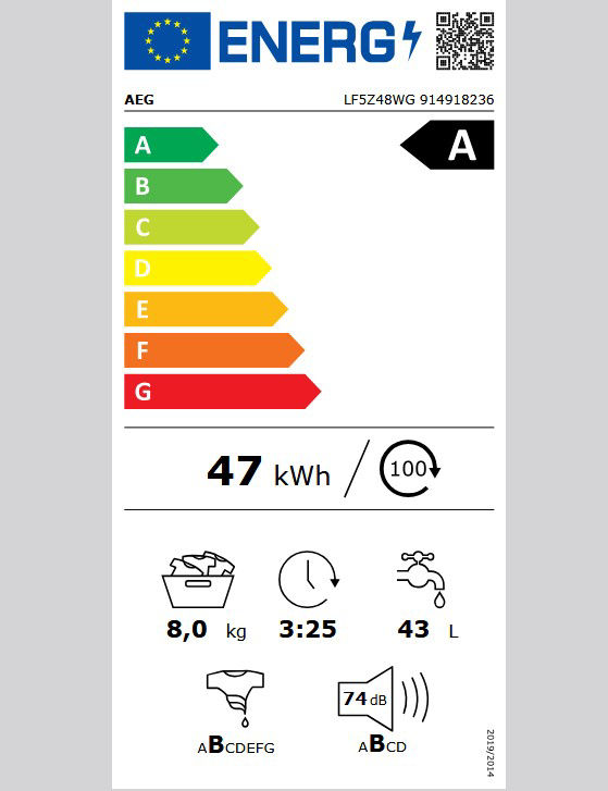 Σταθμισμένη κατανάλωση ενέργειας σε kWh ανά 100 κύκλους πλύσης του προγράμματος eco 40-60 (ΕΕ 2017/1369): 47