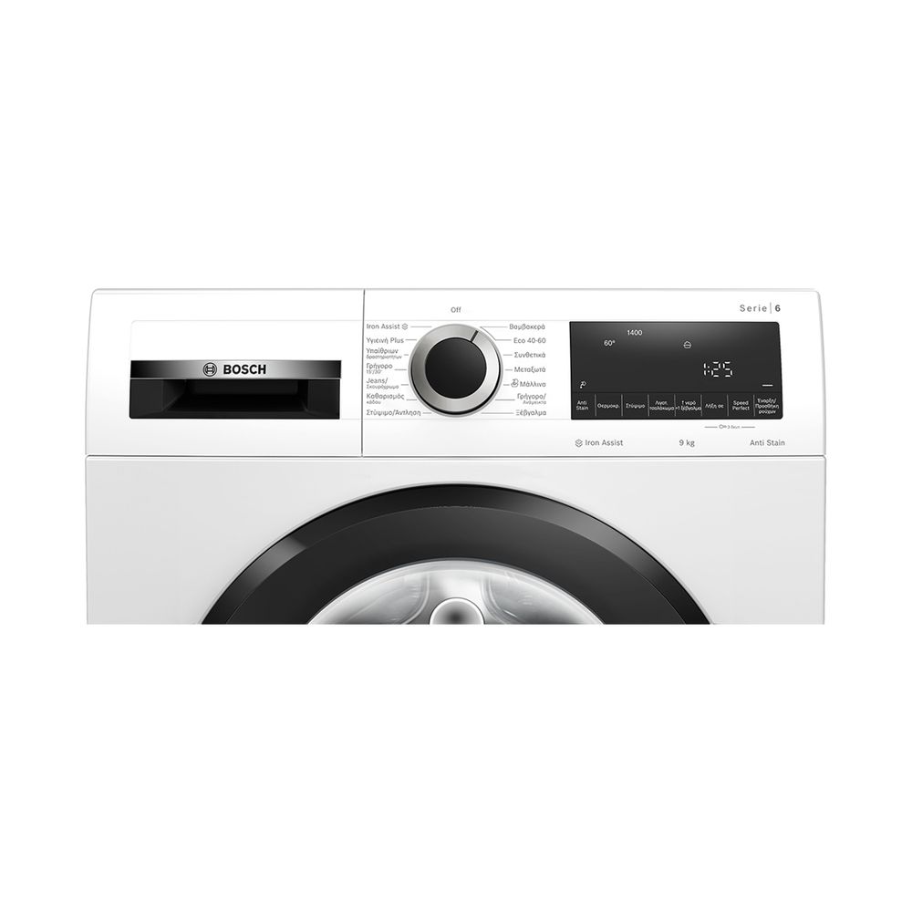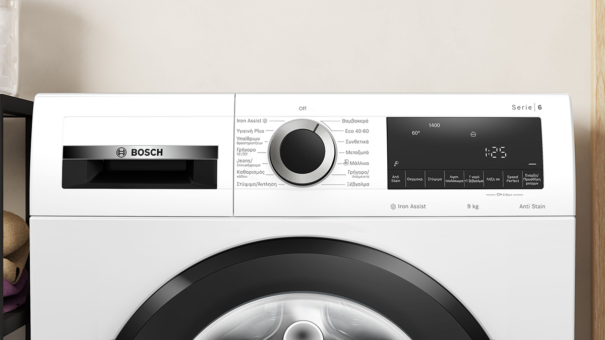 Bosch WGG144ZKGR washing machine 9kg washing capacity from Plus Series, A energy class, 1400 rpm with 5 years guarantee. Features Iron Assist which reduces creasing in clothes by up to 50%, Eco silence drive – silent and durable motor with 10 year warranty, AntiStain option that effectively removes the 4 most common types of stains and Hygiene Plus program which ensures hygienically clean clothes. In addition, features ActiveWater -recognition quantity clothes and regulation of water consumption, SpeedPerfect for time reduction, TouchControl and large, easy to read display with indicators of program progress, temperature, spin speed, remaining time.
