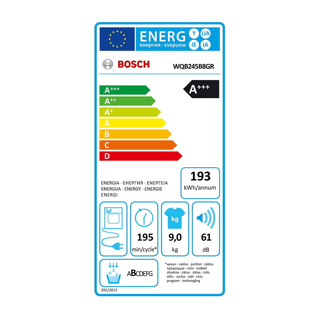 Bosch WQB245B8GR Dryer 9Kg , A+++ energy class, with Smart Dry technology that simplify drying, since your dryer communicates with the washing machine via Wi-Fi to automatically select the correct drying program based on the last wash cycle. It also features easy-to-use Comfort Control with touch buttons which helps you find the program you need quickly and easily, AutoDry technology for controlled drying by temperature and humidity sensors and SelfCleaning condenser, which guarantees exceptional performance and life-saving low consumption.