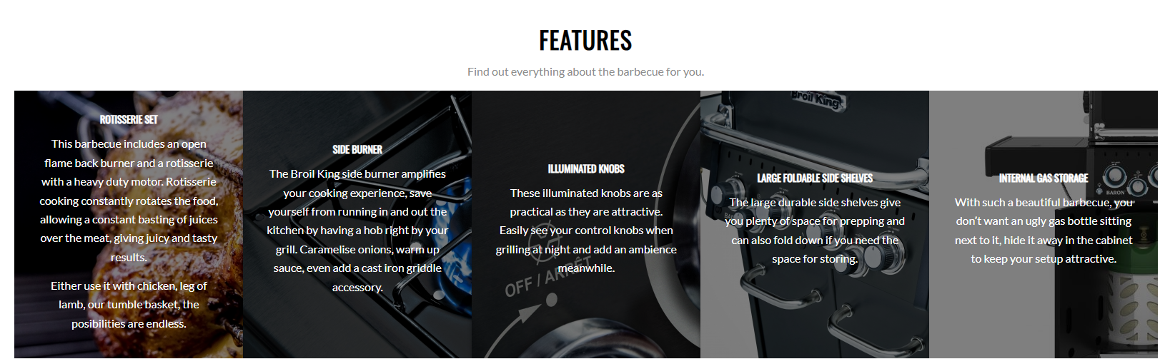 The Baron™ 490 ‘Shadow’ Series features 2,968 sq. cm primary cooking surface and includes 4 stainless steel Dual-Tube™ burners, cast aluminum cookbox, reversible heavy-duty cast iron cooking grids, illuminated control knobs, stainless steel Flav-R-Wave™ cooking system, and electronic ignition. The 490 cabinet series features stainless steel lid and doors and black powder coat drop down side shelves, and an enclosed cabinet base.