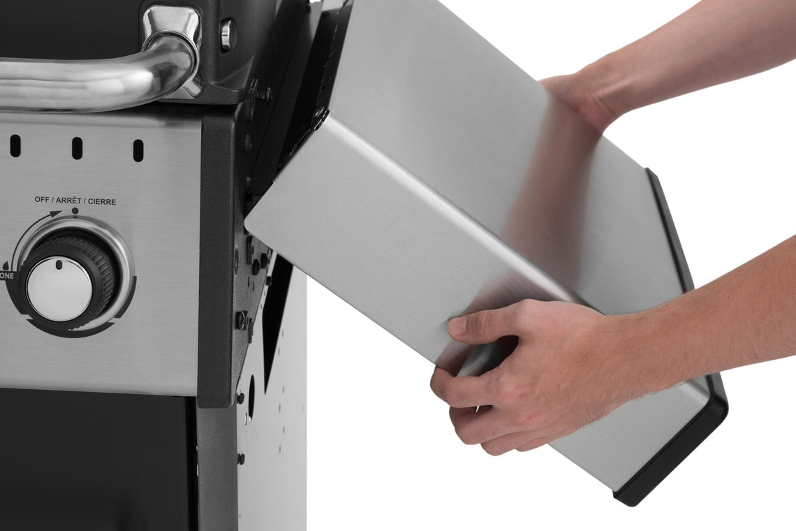 <p>Stainless steel hood panel with cast aluminum end caps<br><br>Therma-Cast™ aluminum cook box<br><br>Stainless steel lid with rugged cast aluminum end caps<br><br>Enclosed black cabinet base with stainless steel cabinet doors<br><br>Stainless steel control panel with build in panel lights<br><br>Stainless steel drop-down side shelves with easy lock<br><br>Heavy-duty locking swivel casters</p>