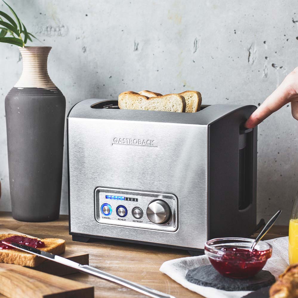 - 7 toast programmes with preset toasting times for wholemeal bread, white bread, bagels, sweet bread, toast waffles, English muffins or gluten-free bread