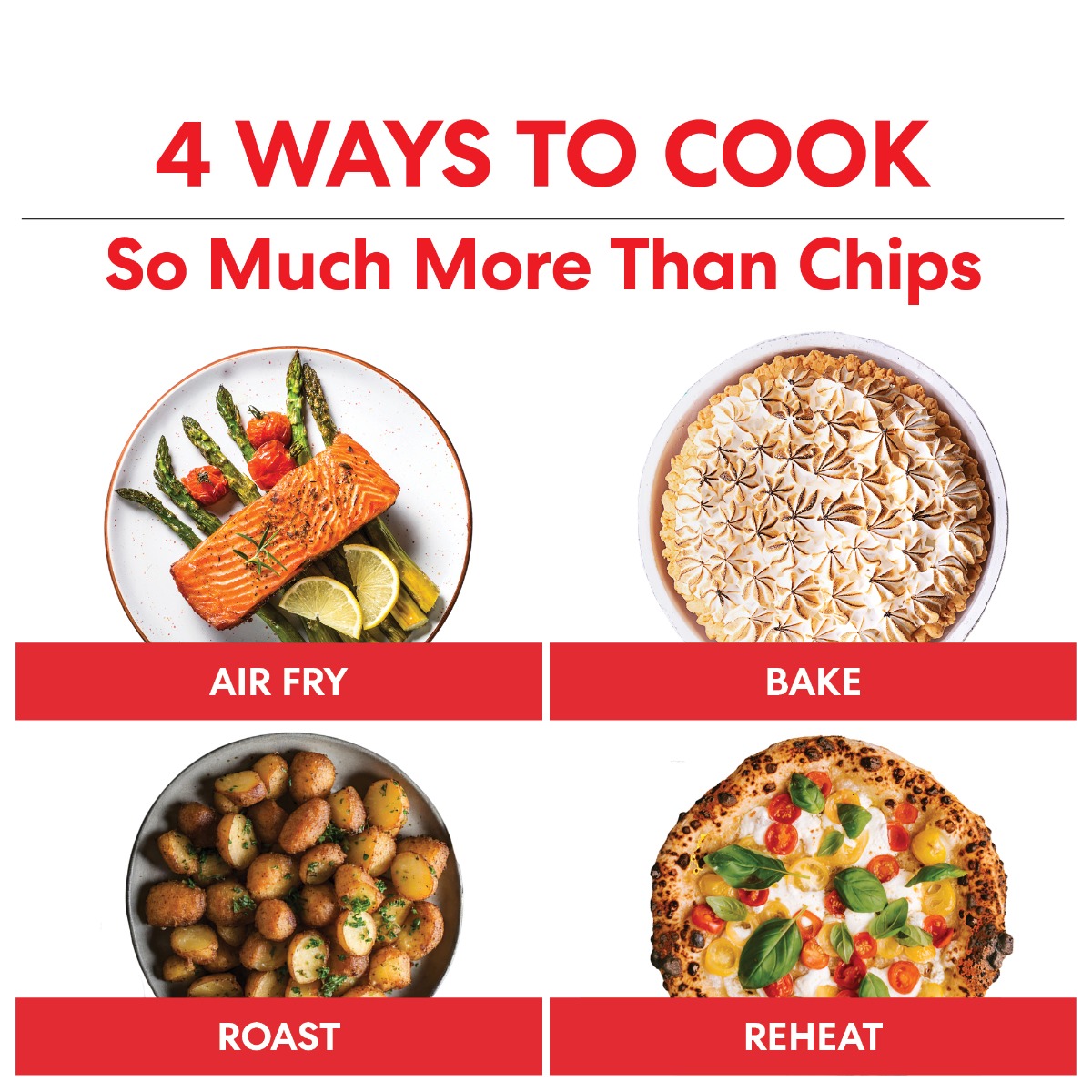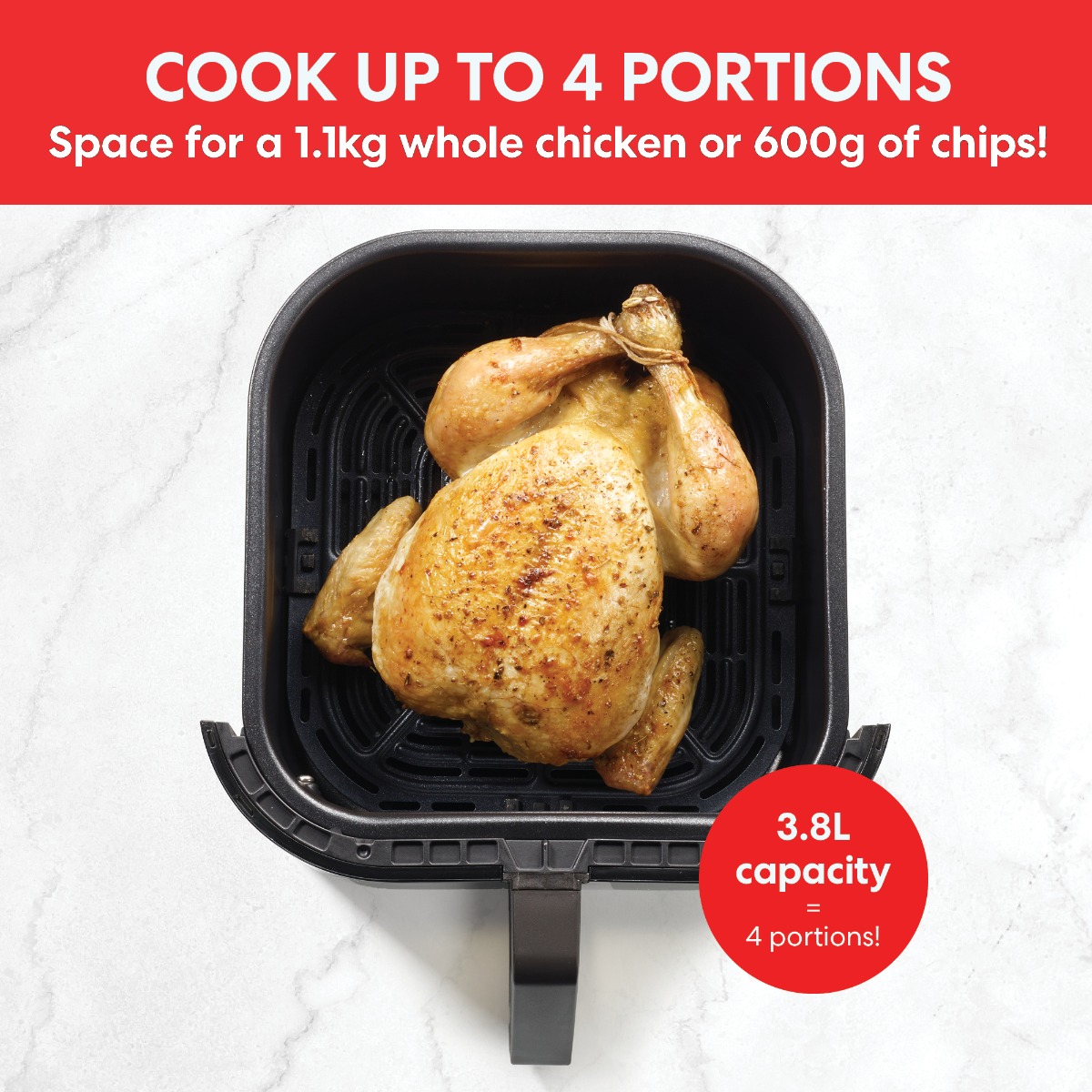 <p>The versatile Vortex 3.8L has 4 functions in one: Air Fry a variety of foods quickly and healthily, like chicken wings, chips, onion rings with 95% less oil. Bake delicious cakes and pastries; Roast meats or vegetables without turning on the big oven and Reheat Leftovers. Cooks from fresh or frozen, it’s healthy convenience at its best! The countertop-friendly size fits any kitchen, with space for 450g of chips or a 900g chicken, making it a versatile tool, helping you create delicious meals quickly and easily.</p>