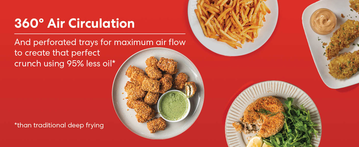 - COOK DISHES THAT ARE TENDER INSIDE & CRISPY OUTSIDE 360° hot air circulation and perforated cooking trays designed for maximum air flow ensure even results.