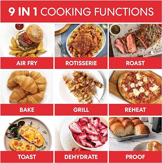- MULTIPLE WAYS TO COOK A SPEEDY WEEKDAY MEAL – you can Air Fry, rotisserie, roast, grill, bake, toast, reheat, plus bonus dehydrate & proofing functions too!