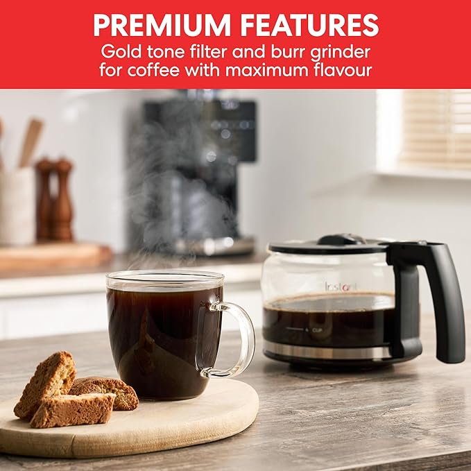 PREMIUM FEATURES FOR A FULL FLAVOUR EXPERIENCE – the reusable gold tone coffee filter allows more natural oils to be released from the grounds, resulting in a richer flavour, while the burr grinder ensures consistent grinding results.