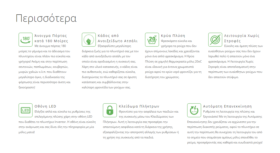 Όλα τα πλυντήρια ρούχων Inventor διαθέτουν Ελληνικό Μενού για να μπορείτε να χρησιμοποιείτε εύκολα και γρήγορα τη συσκευή και εσείς και όλα τα μέλη της οικογένειάς σας.