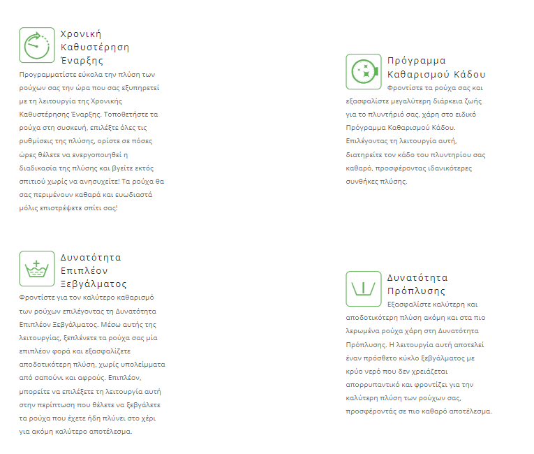Φροντίστε τα ρούχα σας και εξασφαλίστε μεγαλύτερη διάρκεια ζωής για το πλυντήριό σας, χάρη στο ειδικό Πρόγραμμα Καθαρισμού Κάδου. Επιλέγοντας τη λειτουργία αυτή, διατηρείτε τον κάδο του πλυντηρίου σας καθαρό, προσφέροντας ιδανικότερες συνθήκες πλύσης.