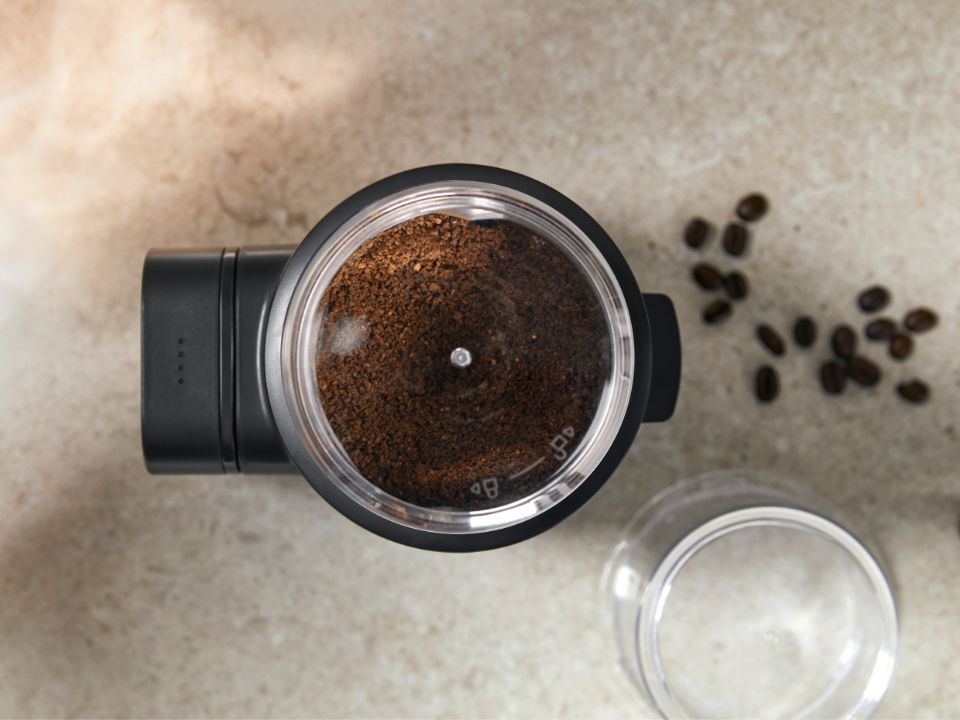 Get up to 6 minutes’ coffee grinding time** with this powerful, portable coffee grinder. Simply plug the battery (not included in this model) onto the grinder base and click into place. Indicator LED lights on the side of the battery show you how much charge is left.