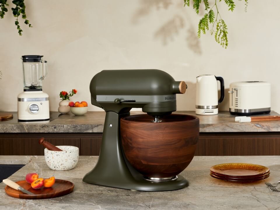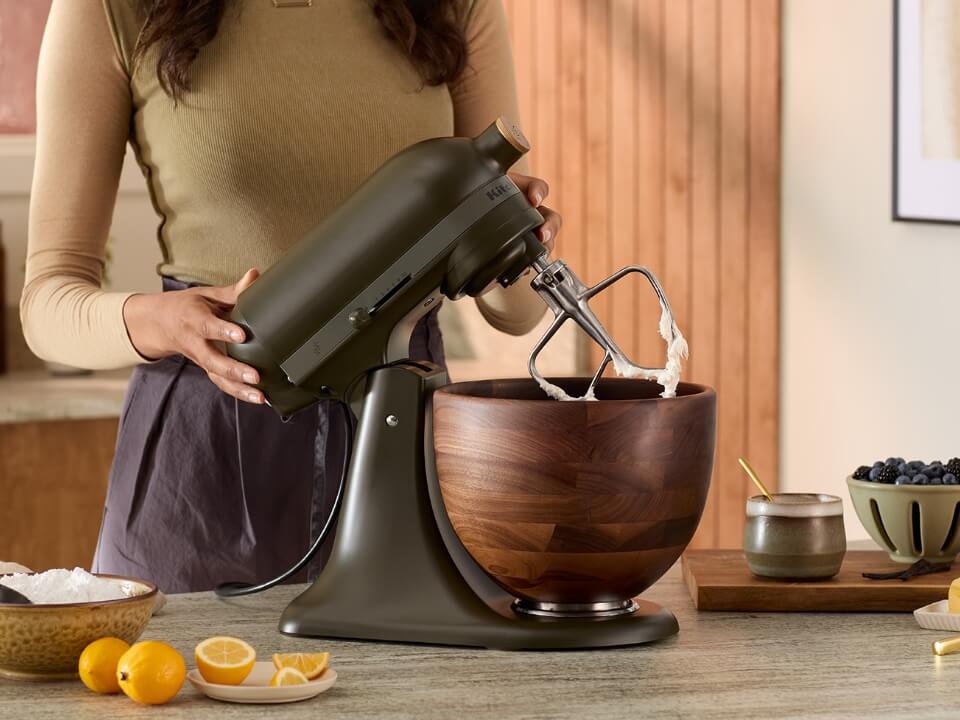 Fresh from that series comes the KitchenAid Evergreen tilt-head mixer, deep green, with a true walnut bowl. Like a breath of fresh air, it brings the essence of outdoors within, echoing the rich hues of a tree-filled forest.
