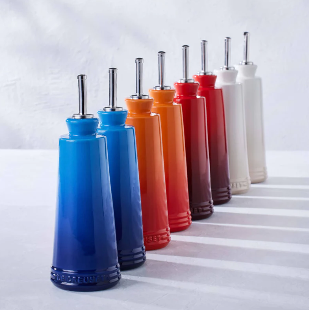 Whether dressing a salad or adding a drizzle of oil to a hot pan, this contemporary stoneware set is designed for everyday use. It includes one cruet with Le Creuset branding and one without for easy identification, along with stainless steel nozzles for precise pouring.