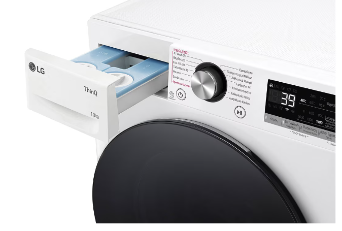Lg F4R7510TSWB washing machine with a capacity of 10 kg, A energy class & 1400 spin speed. Features ezDispense™ automatic dosing system, TurboWash™ 360 for quick washes in just 39′ and Steam technology which eliminates allergies with the power of steam. In addition, features AI Inverter Direct Drive™ Motor which automatically selects the optimum drum movements for the fabrics and SmartThinQ™ application for for remote control via smartphone or tablet.