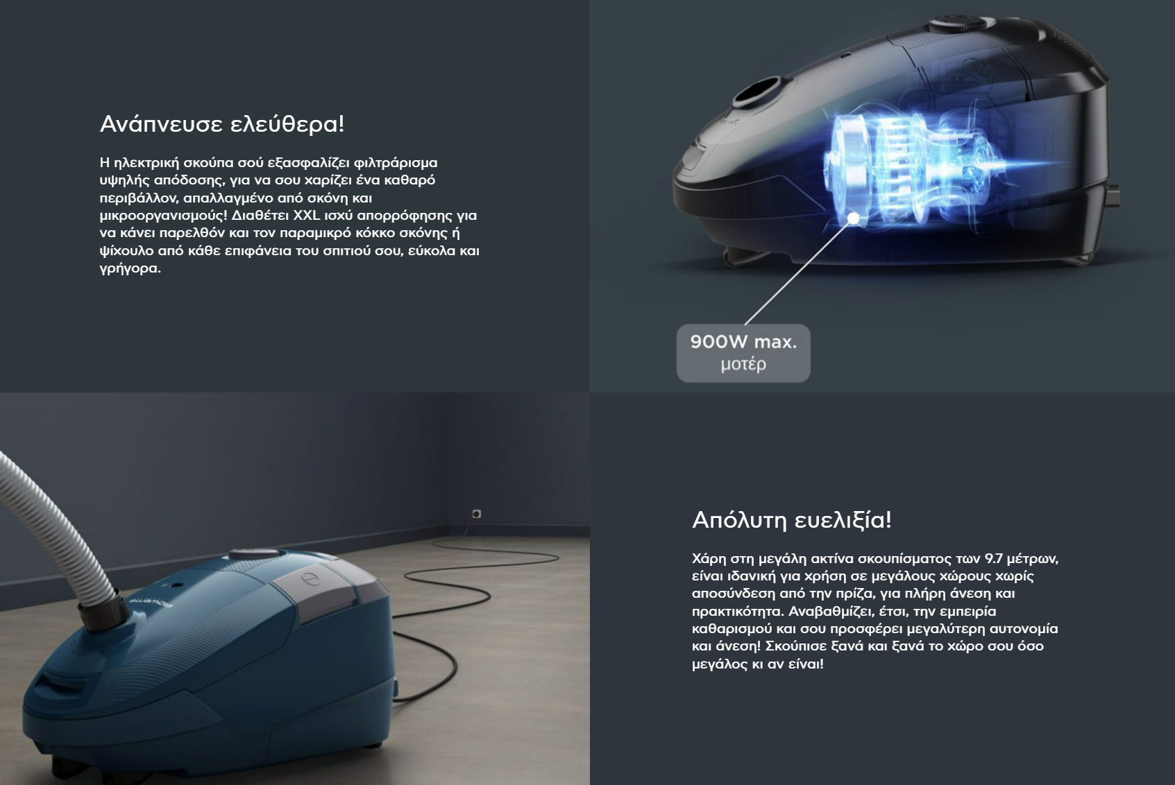 Ψάχνετε μια ισχυρή ηλεκτρική σκούπα που να ανταποκρίνεται σε κάθε καθαριστική πρόκληση; Η Power XXL φτιάχτηκε για εσάς! Προσφέρει εξαιρετικά καθαριστικά αποτελέσματα με μοτέρ χαμηλής κατανάλωσης* έως 900 W και φιλτράρισμα 2 επιπέδων (φιλτράρισμα τουλάχιστον 99%) για καθαρή ατμόσφαιρα. Αυτή η ηλεκτρική σκούπα είναι ο καλύτερος σύμμαχός σας για το σκούπισμα μεγάλων επιφανειών σε βάθος: Χάρη στη μεγάλη ακτίνα σκουπίσματος των 9,70 μέτρων και στη χωρητικότητα της σακούλας XXL (4,5 λίτρα), η Power XXL εξασφαλίζει μέγιστη αυτονομία και πρακτικότητα