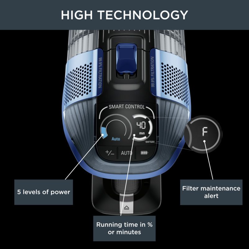 The smart control screen displays the remaining autonomy time and alerts for cleaning the filter, while allowing you to adjust the power according to your needs, with 3 different levels and a Boost button.