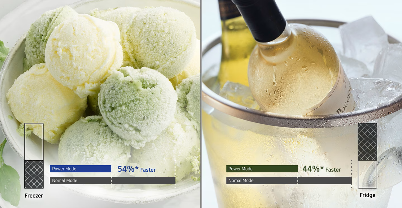 Enjoy fast cooling performance. At the touch of a button, Power Cool distributes strong cold air inside the fridge to rapidly cool your vegetables or your favourite drinks. On the other hand, Power Freeze distributes very strong cold air into the freezer. It is suitable for freezing or stabilizing frozen food and creating ice.