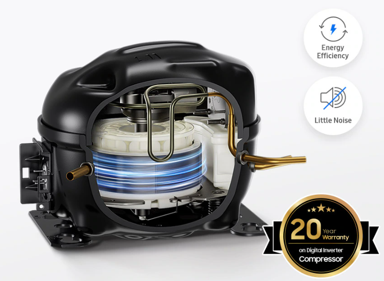 Enjoy smart energy use and long-term performance. The Digital Inverter Compressor intelligently changes the power and automatically adjusts the speed according to cooling requirements. This ensures the temperature is appropriate and efficient, with low noise levels and a 21-year* certification backed by a 20-year warranty** (limited to the compressor only).
