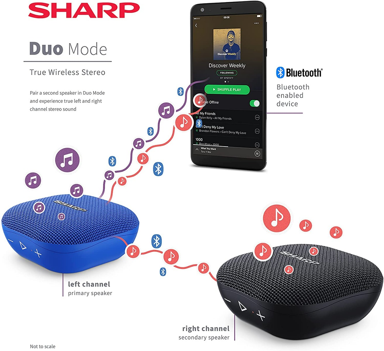 Twice as good: True Wireless Stereo (TWS) technology makes it easy to pair two Sharp speakers for, you guessed it, true wireless stereo. Not only do you get more volume or power but also a wider sound stage. By the way, control is also easy thanks to the duo mode: all you need is to connect your mobile device to one of the two speakers.